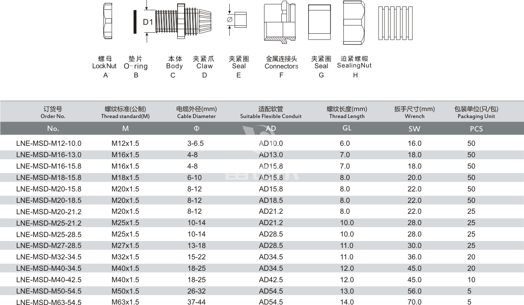 產品名稱:LNE-MSD 黃銅塑料軟管電纜接頭