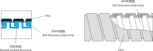 產(chǎn)品材質(zhì):(內(nèi)層)采用304不銹鋼帶制成,(外層)采用TPU原料(低煙無鹵、抗紫外線、防老化)。