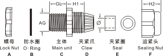 產(chǎn)品材質(zhì): A.C.D.F部位采用尼龍制成,B.E部位采用丁腈橡膠制成。